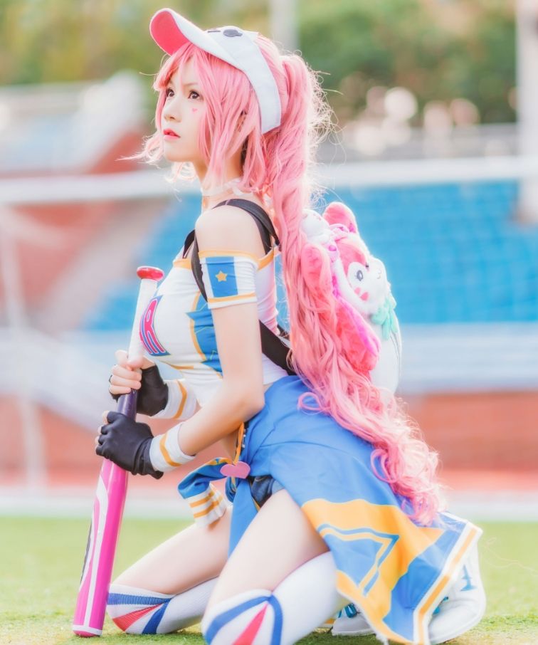 她穿的这套Cosplay服装,真的太有感觉了,精致的设计结合了运动风和甜美的元素,色调鲜艳,满满的活力。看到桜桃喵拿着球棒的样子,立马让我想到了那些年在球场上奔跑的日子,轻松自在,却又带着一些不言而喻的坚韧。
